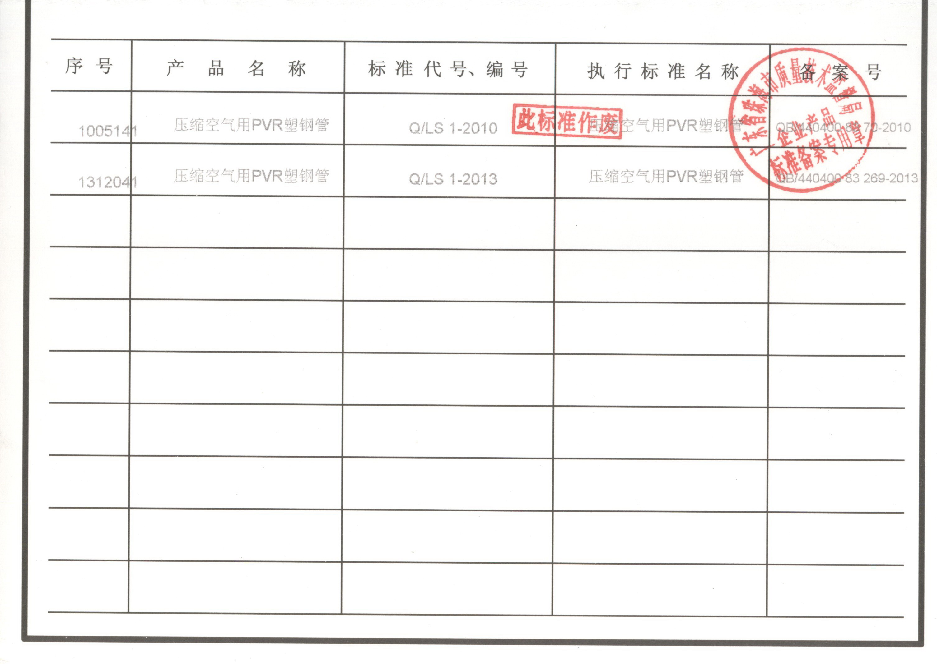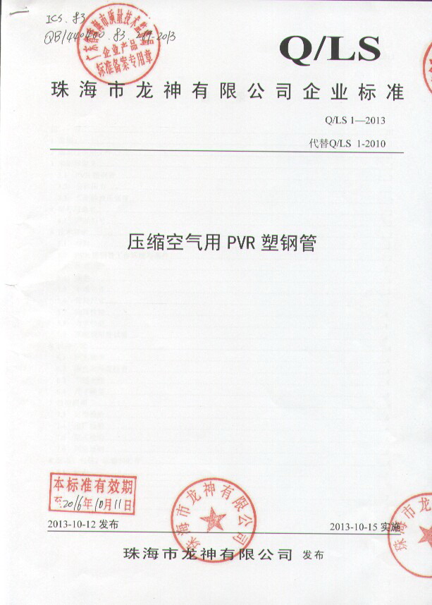 企業(yè)執(zhí)行標(biāo)準(zhǔn) 珠海市企業(yè)產(chǎn)品執(zhí)行標(biāo)準(zhǔn)證書 珠海市龍神有限公司企業(yè)執(zhí)行標(biāo)準(zhǔn) 壓縮空氣用PVR塑鋼管 2012-11-27 35498