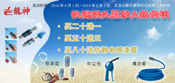 2014年6月法國(guó)佩釜標(biāo)準(zhǔn)快速接頭“爽一夏”讓利大促銷 2014-05-30 43404 1、買二十送一(即買二十個(gè)快速接頭送一個(gè)法國(guó)佩釜快速接頭或法國(guó)佩釜吹塵槍(編號(hào):38016)一把) 2、買五十送三(即買五十個(gè)快速接頭送三個(gè)法國(guó)佩釜快速接頭或法法國(guó)佩釜吹塵槍(編號(hào):38016)三把) 3、買八十送一卷防靜電噴漆軟管(編號(hào):36323)